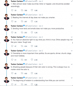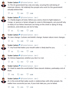 These screen caps are too small, but I suppose you can just search twitter for the thread (that's how I found it after seeing somebody quote it). Tucker Carlson (whose show I don't watch, but there are some hilariously edited clips online), gave 20 pieces of advice for the New Year. I found 5 to be obvious but easily forgotten. 7 is straight out of Epictetus (which means it's probably good advice). He's wrong about food. My mouth waters for steak and eggs. He's also right to emphasize personal responsibility for your emotional state and life in general.