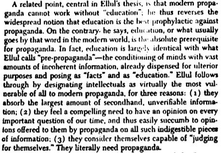 A related point, central in Ellul's thesis is that modern propaganda cannot work without "education"; he thus reverses the widespread notion that education is the best prophylactic against propaganda. In fact, education is largely identical with what Ellul calls "pre-propaganda" - the conditioning of minds with vast amounts of incoherent information, already dispensed for ulterior purposes, posing as "facts" and as "education." Ellul follows through by designating intellectuals as virtually the most vulnerable of all to modern propaganda, for three reasons: